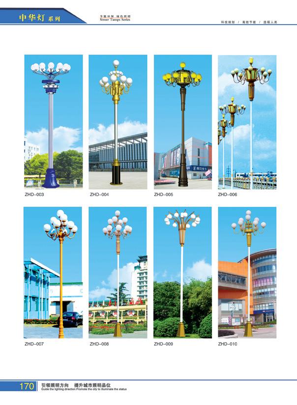 外观古朴大方,一般有多个光源,多见为6~12个,照明度高,景观效果好,是传统式的代表系列之一。灯罩为压克力罩PC或者是进口PNNA有机材料,底座一般为铝制或者是铁制。灯杆一般为Q235钢材卷制而成,厚度多为:2.75~3.5mm;高度多为:6~10m;紧固件螺钉、螺母为不锈钢(外露)。中华灯组成:灯罩 光源 灯杆 基础 适用场所:码头 广场 公园 街道 性能用途 光源:高瓦数节能灯或高压纳灯